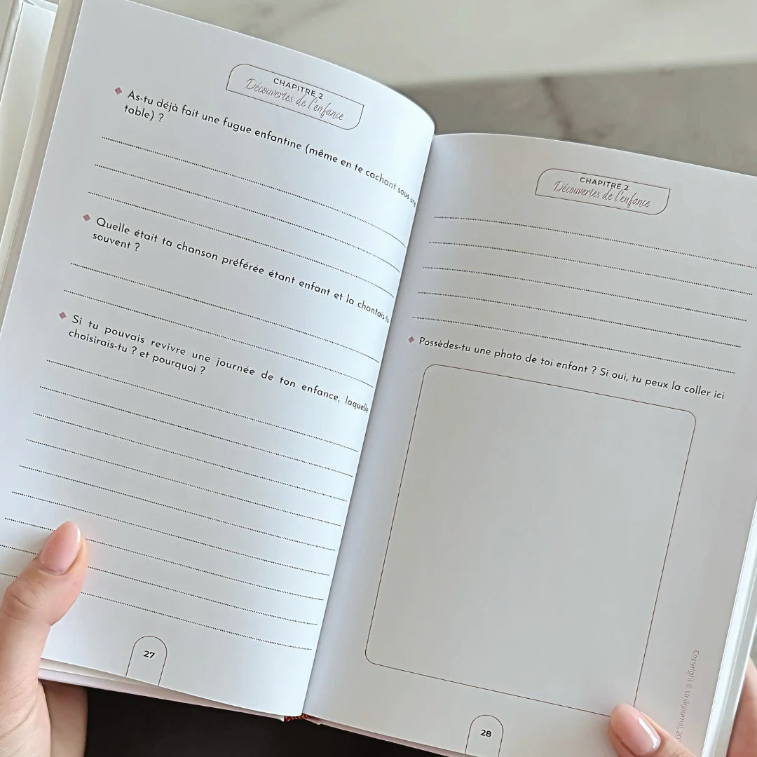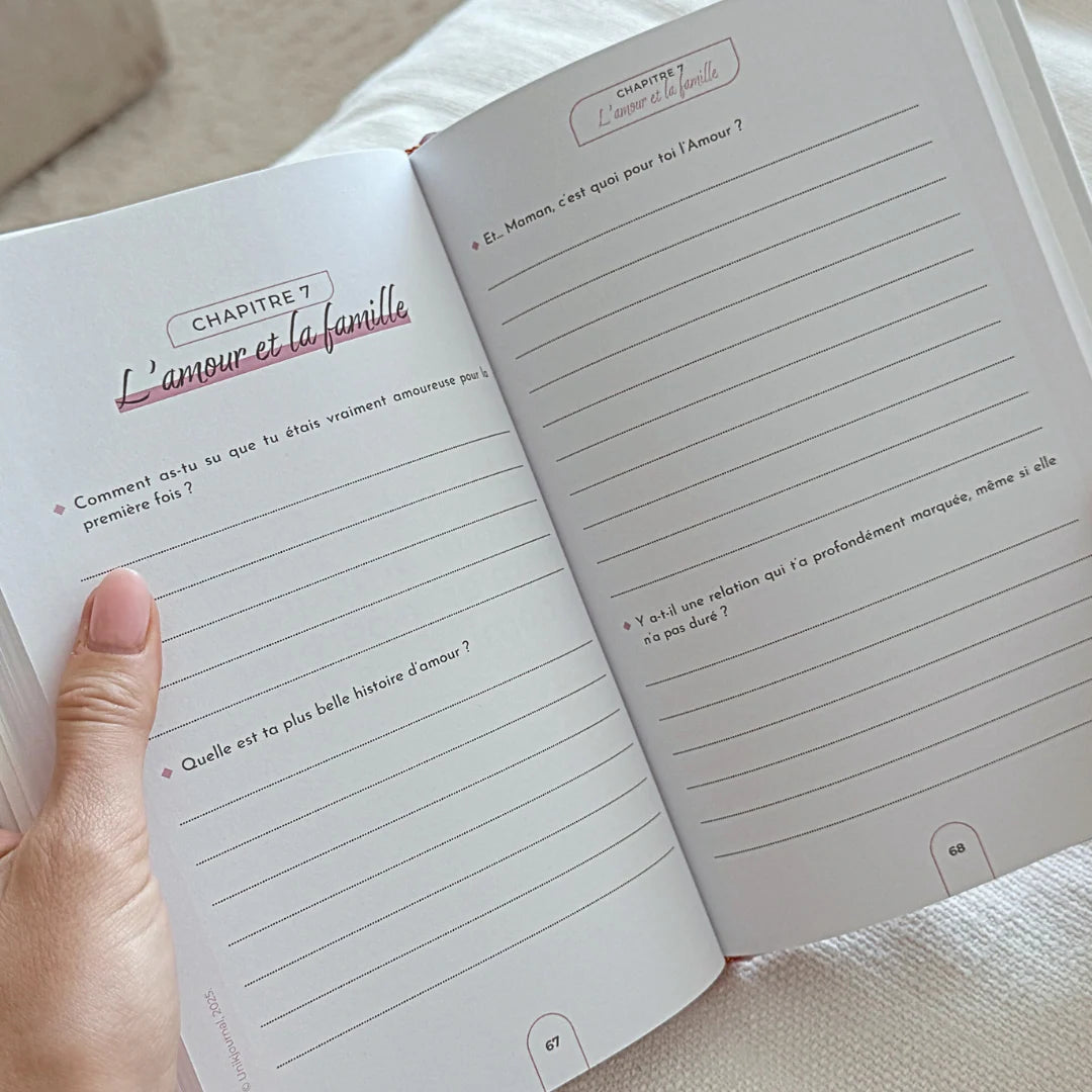 Le journal est entièrement guidé avec plus de 100 questions soigneusement sélectionnées pour aider à raconter des souvenirs personnels, des anecdotes et des émotions profondes.